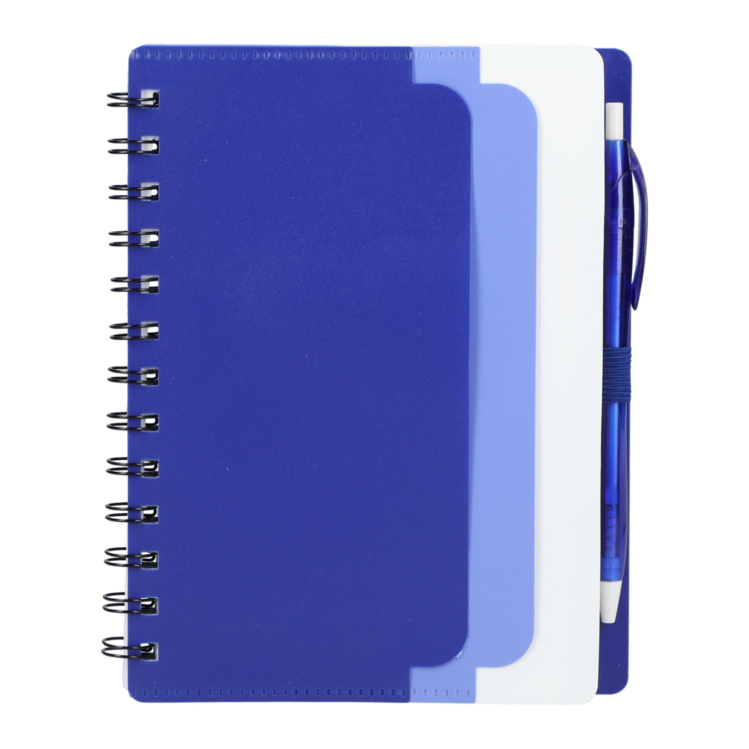 Discover the eco-conscious choice with the 5'' x 7'' Recycled Dual Pocket Spiral Notebook with Pen. Its 100% recycled PP cover includes dual front pockets for document storage, all within a practical spiral design. Featuring 70 sheets of recycled white lined paper, a color-matching pen loop, and an RPET color matching pen with smooth black ink, click action, and a 1mm tip providing 600 meters of writing length. As part of our commitment through 1% For The Planet, one percent of sales from all EcoSmart® products contribute to environmental nonprofits. Opt for sustainability in your note-taking. Note that pens are packed separately.