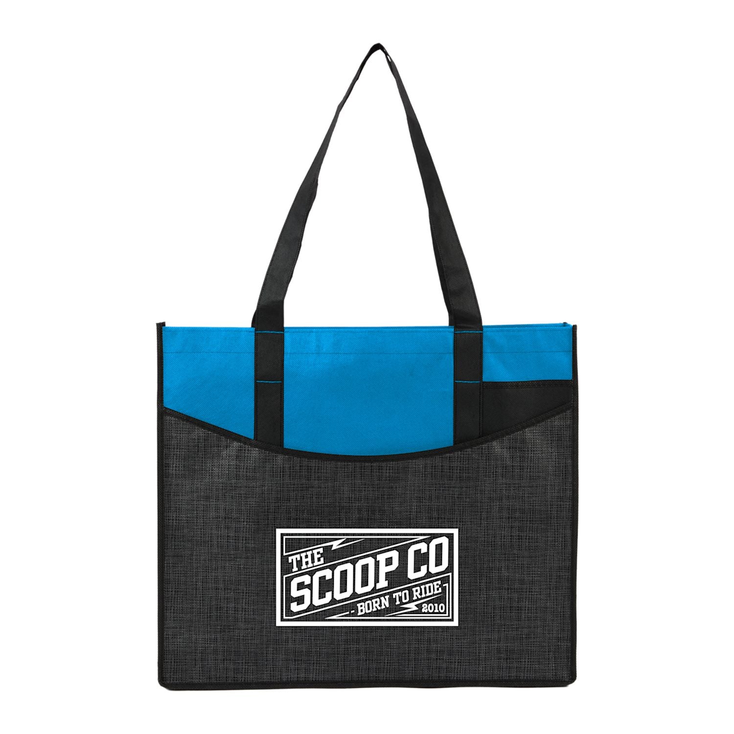 The Brooke Recycled Non-Woven Convention Tote is a fun take on the traditional convention tote. Featuring a fun pop of color this tote will surely stand out. With a fun swoop front pocket and pen slots this tote is all you need for your next show! Made with recycled materials this tote gives 1% to the Planet!