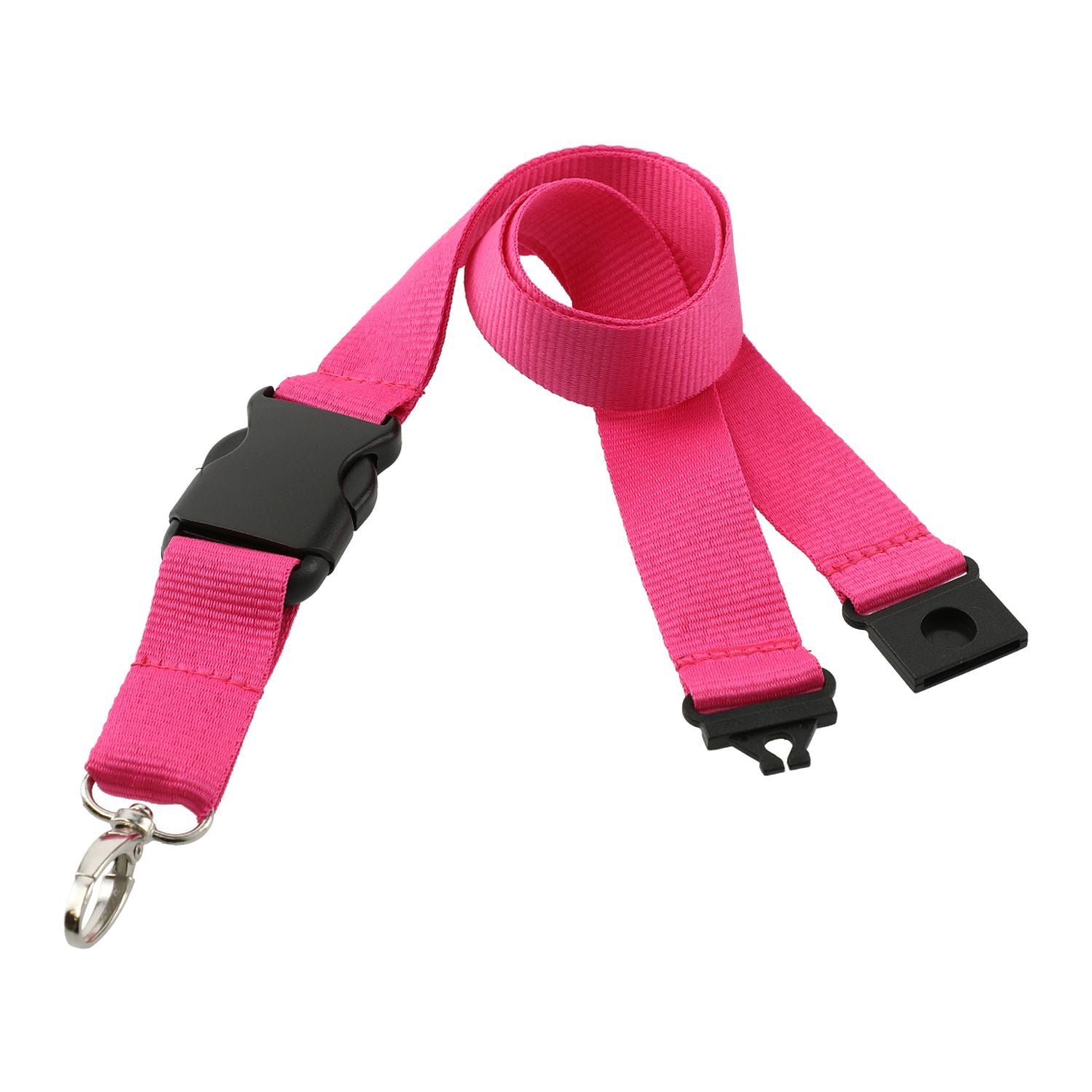 The Bullet Hang In There Lanyard is a 1-inch wide and 20-inch long lanyard with a breakaway neck clip. This versatile lanyard also includes a detachable plastic clip and a wide metal swivel hook. Use it to carry your badge, ID card, or keys. Second location setup and run charge waived if both sides are decorated with the same artwork.