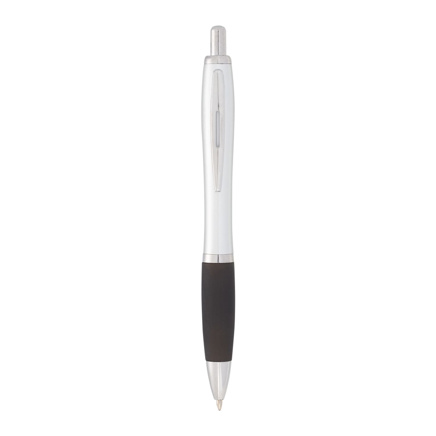 The Nash Ballpoint Pen features a click-action retractable ballpoint with a black ink cartridge. The barrel features a comfortable soft grip, available in multiple colors. Soft grip not compatible with solid silver.