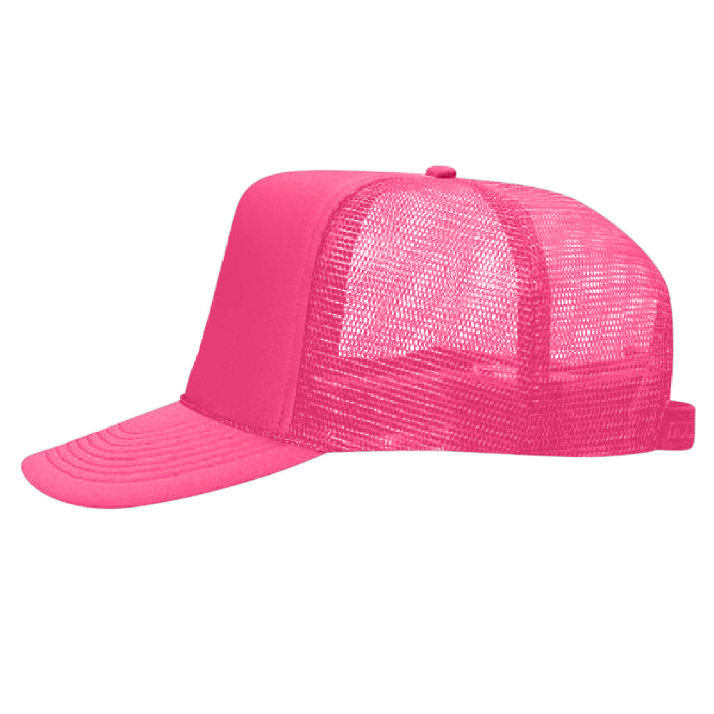 This is a 5-panel trucker cap with a seamless foam front panel with lining. The traditional look comes with matching color braid, fabric under visor and sweatband. A 100% Polyester front and mesh back with Foam Front High Crown: 10 cm / 4". A plastic adjustable strap for one size fits all. Perfect trucker hat to customize for your brand or new item for your closet.