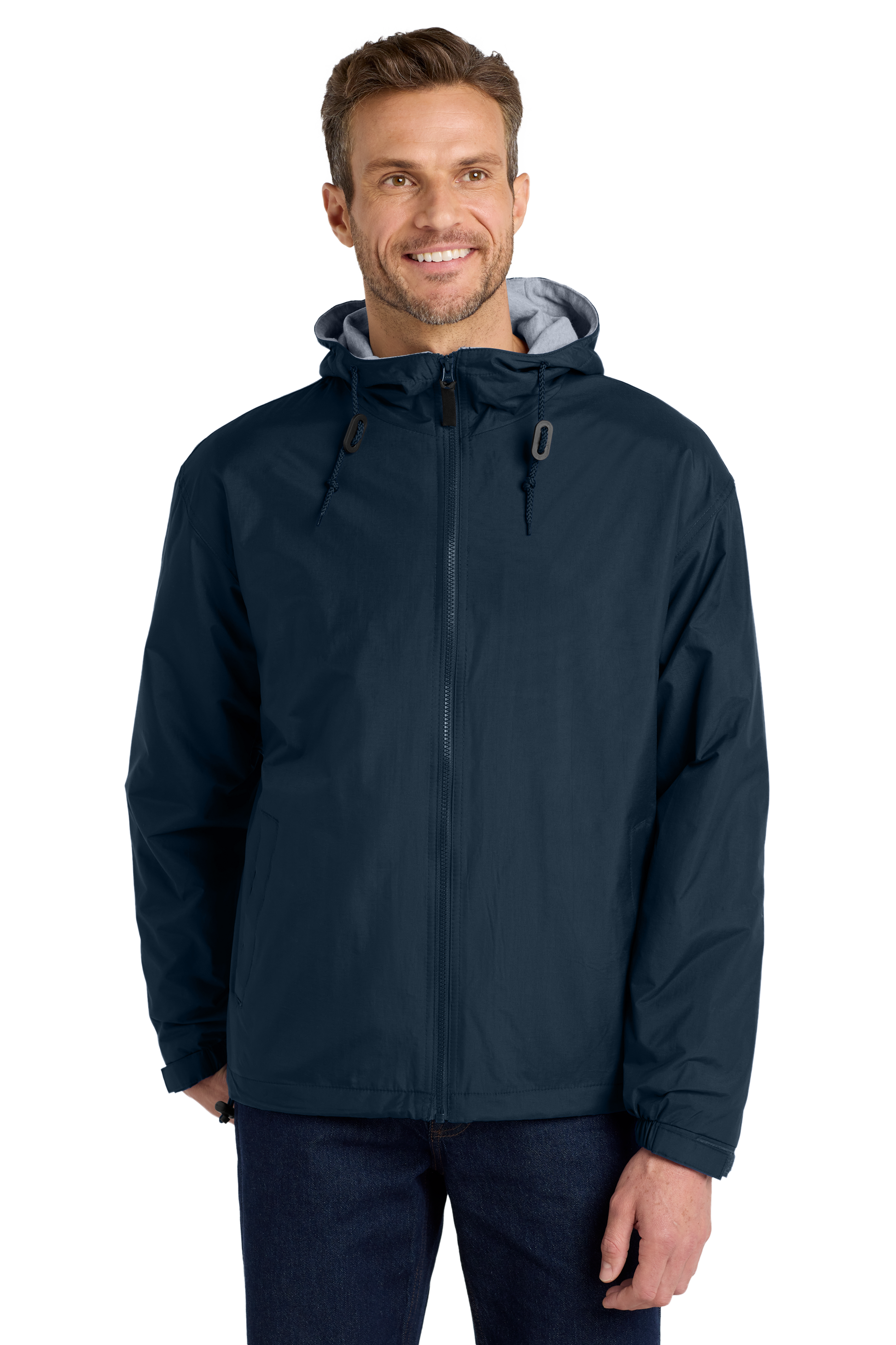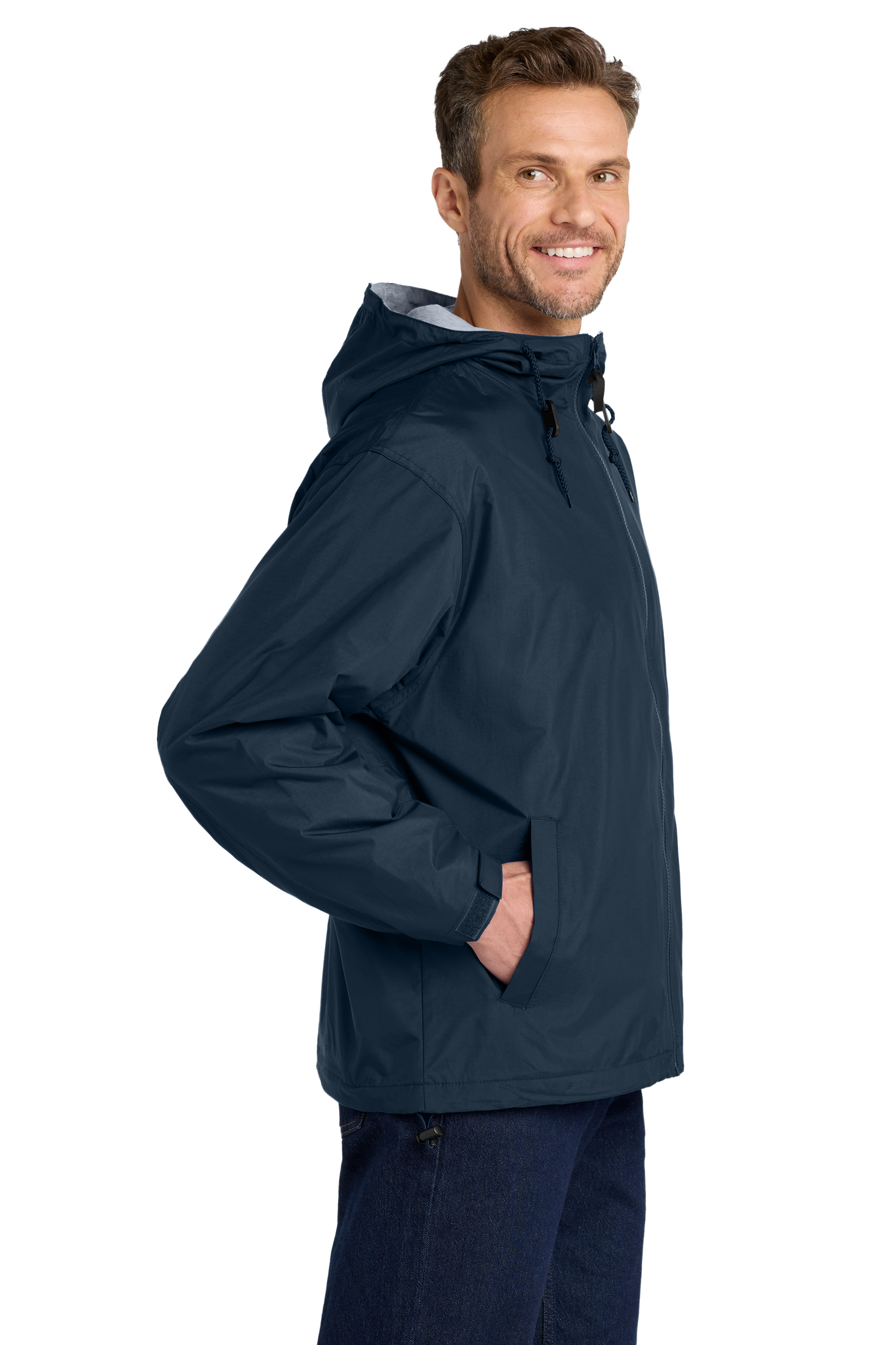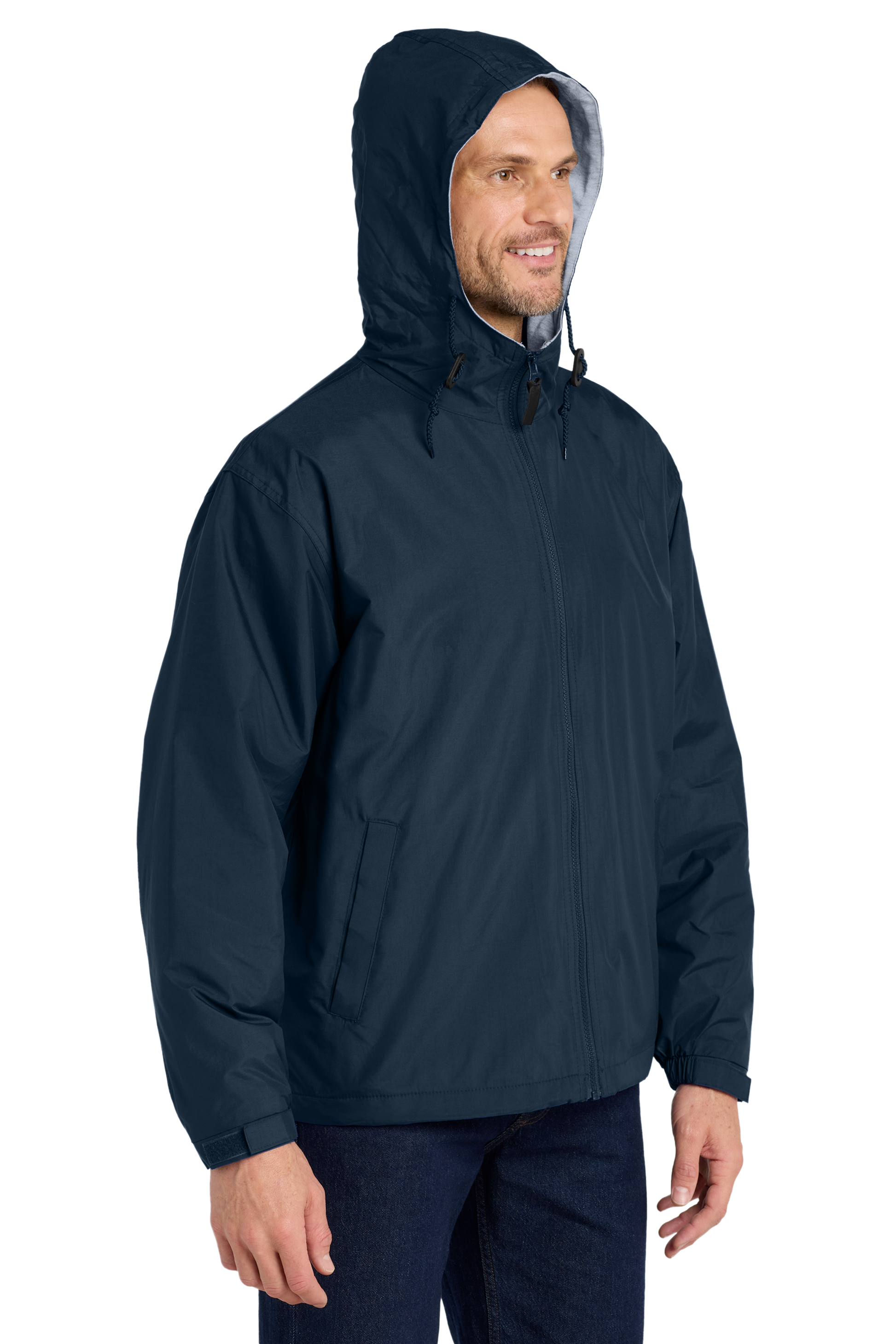 With sporty styling, the nylon shell repels water while the sweatshirt fleece lining provides comfort and warmth.