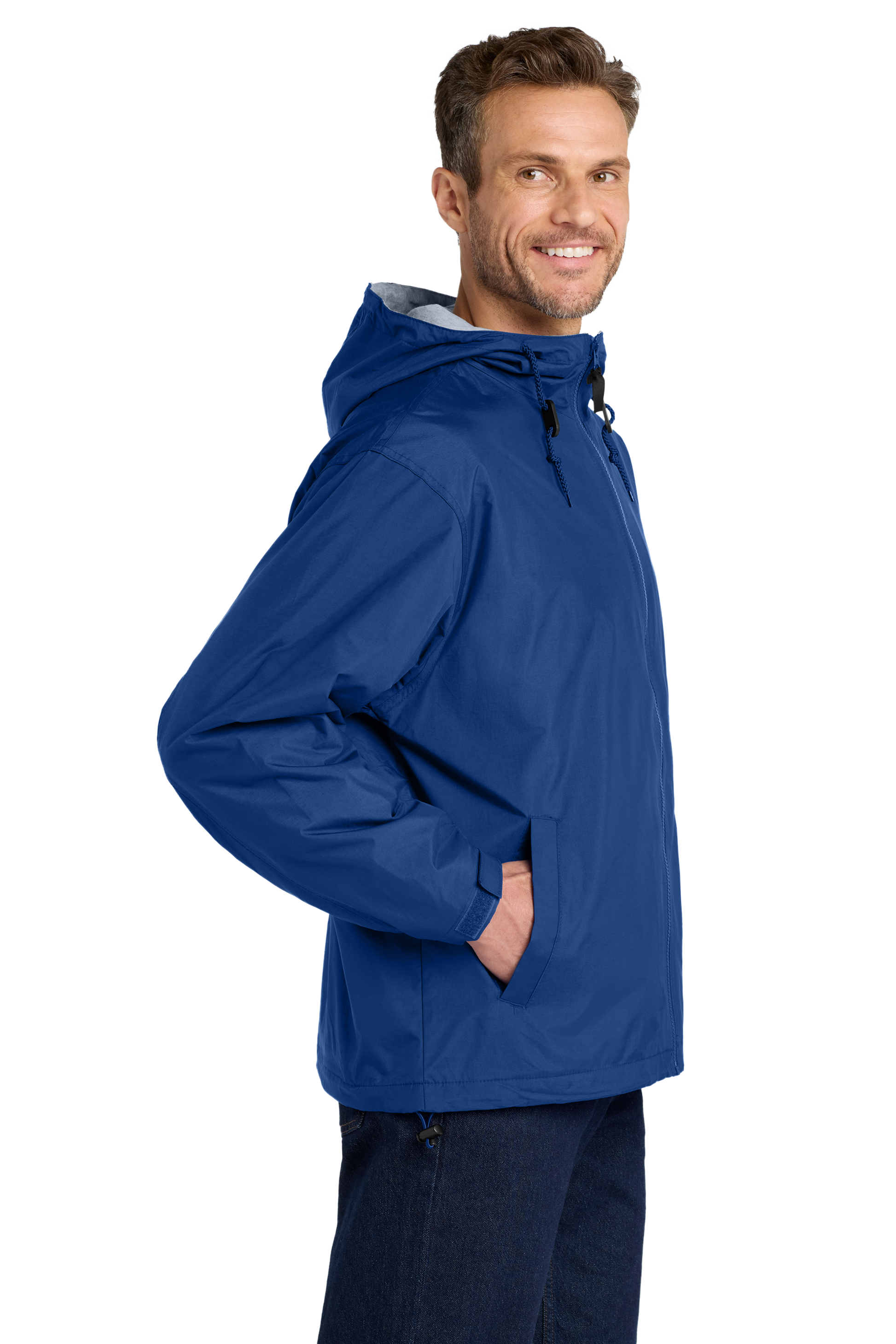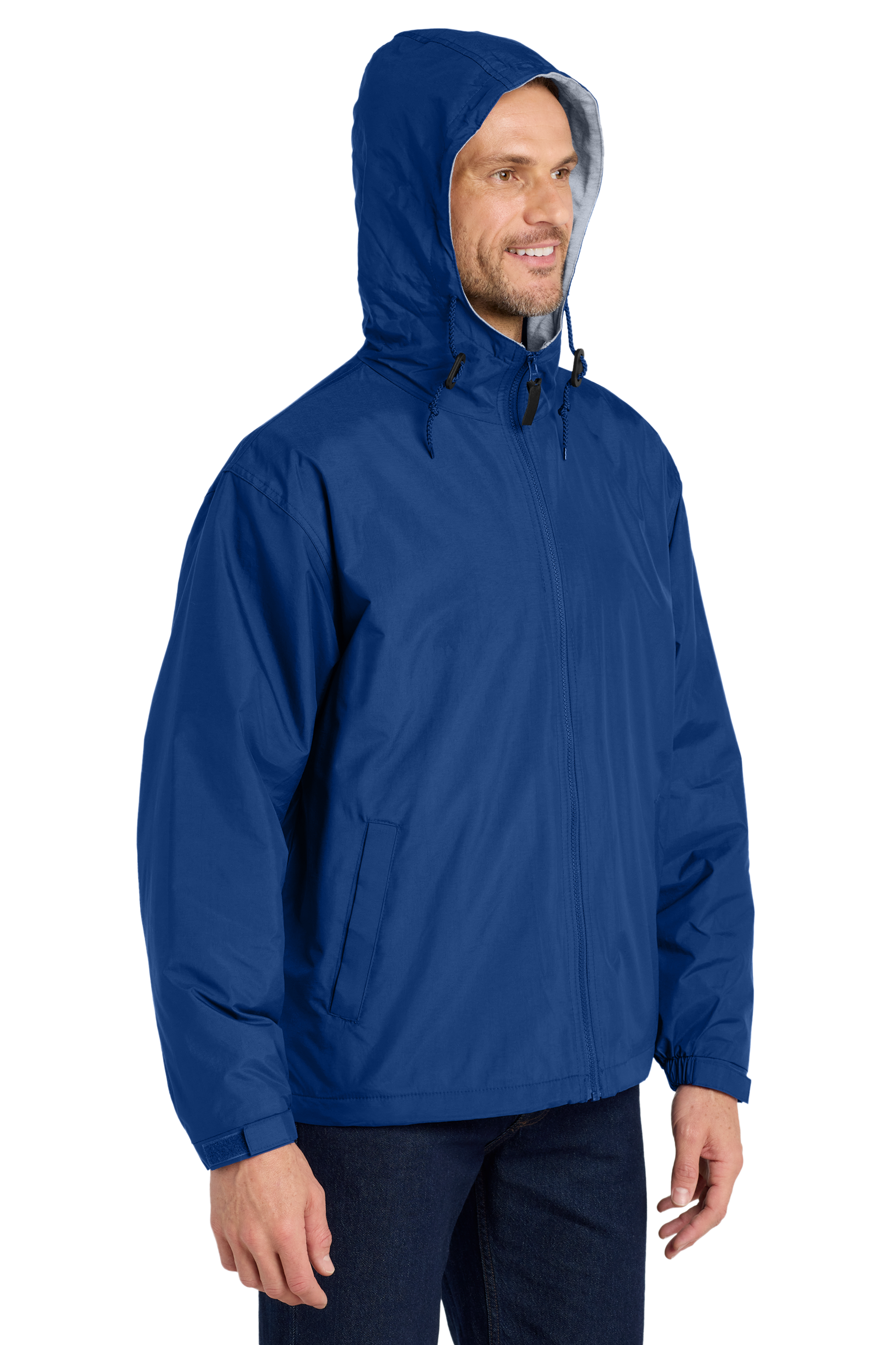 With sporty styling, the nylon shell repels water while the sweatshirt fleece lining provides comfort and warmth.