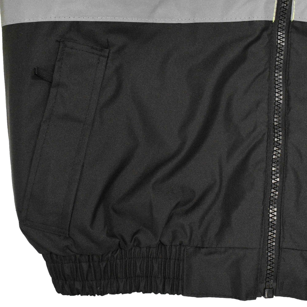 Radians SJ210B three-in-one deluxe bomber jacket with black bottom has a zip out fleece jacket, concealed attached hood, elasticized waistband and several inner and outer pockets. Safety jacket has 2" silver reflective tape for high visibility.