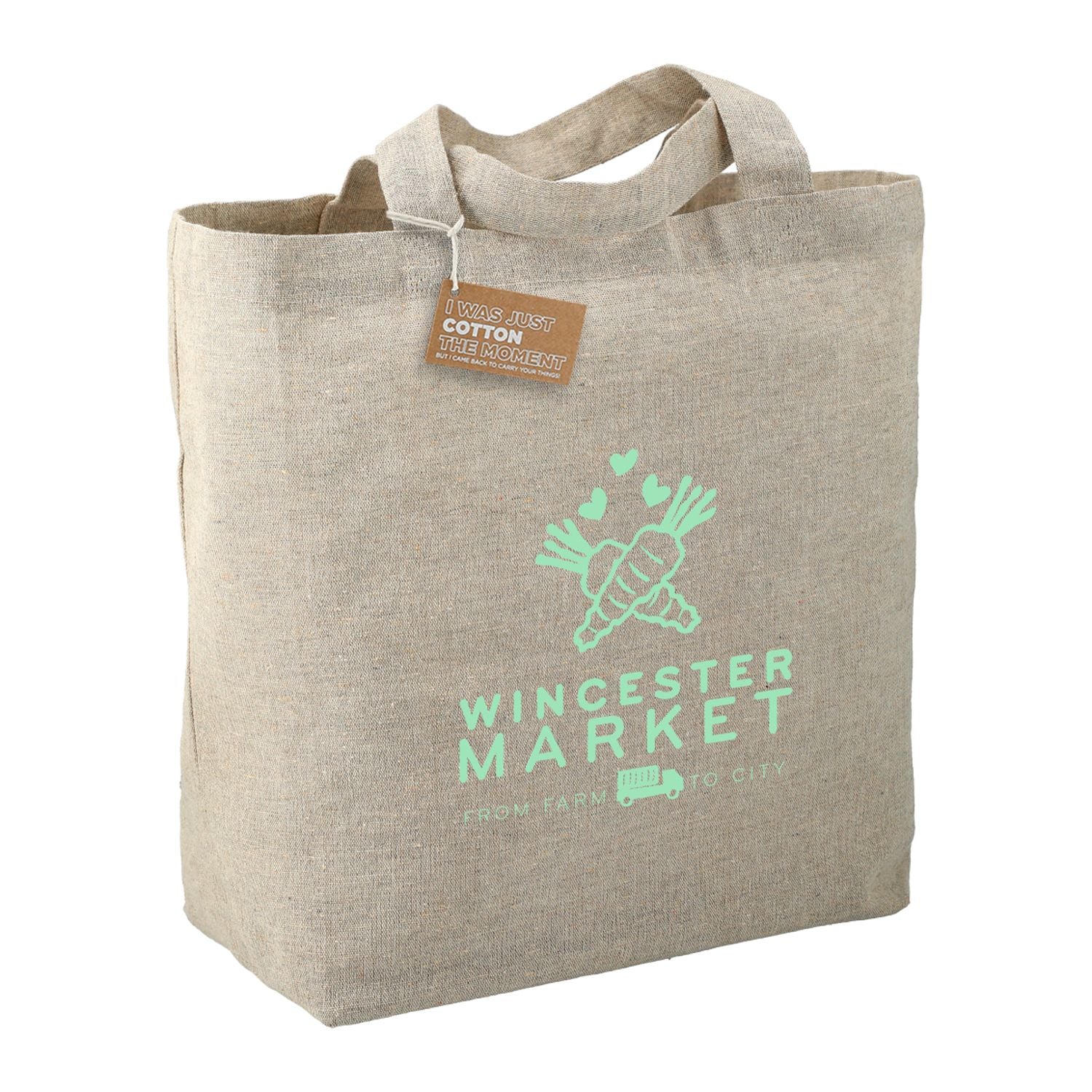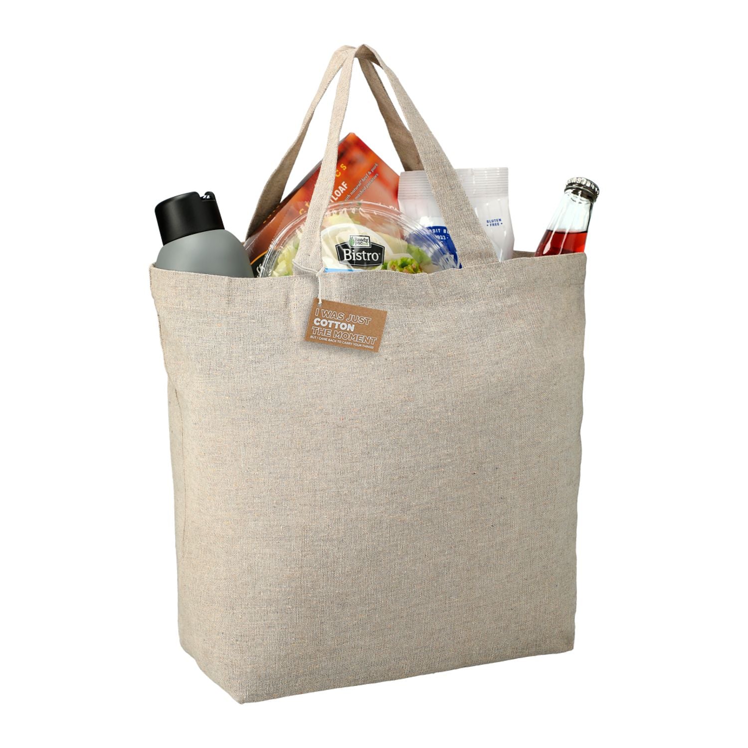 The 5oz Cotton Twill Recycled Grocery Tote will be your go-to tote on grocery day and helps promote social responsibility. It is manufactured from pre-consumer waste generated by factories during the fabric cutting process. Approximately 70%-80% recycled cotton and 20-30% RPET. Through a partnership with 1% For The Planet, one percent of sales of this and all EcoSmart products will be donated to nonprofits dedicated to protecting the planet. This tote comes with a sturdy covered bottom board and an open main compartment to hold your essentials.