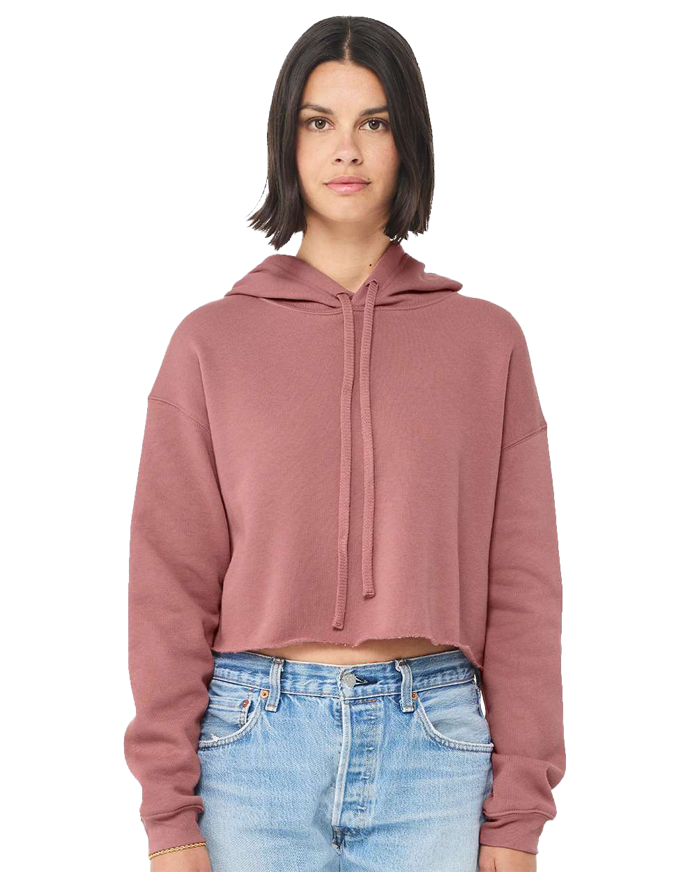 This trendy womens cropped hoodie sweatshirt is a must-have for your fall wardrobe. Its raw edge and dyed to match drawstrings make it fashion forward while the poly cotton brushed fleece brings an unmatched level of comfort.